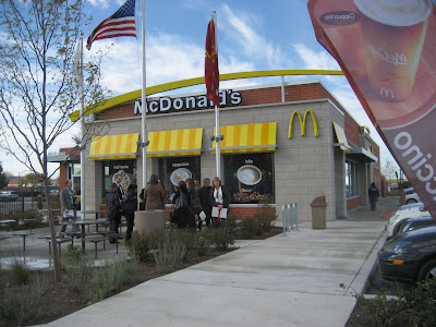 After we departed McDonald's advertising agency, DDB, where we learned of the two latest corporate initiatives, we headed to the McDonald's 50th Anniversary Restaurant located at 600 N. Clark St., in Chicago. It is a pretty special restaurant on one hand as it is relatively large, super tidy, two-storied, double-drive-thru'd, McCafe'd, etc. - yet, on the other hand, it seems pretty normal with all the usual offerings, decor, etc. In other words, it was an exciting place in which to feel at home.